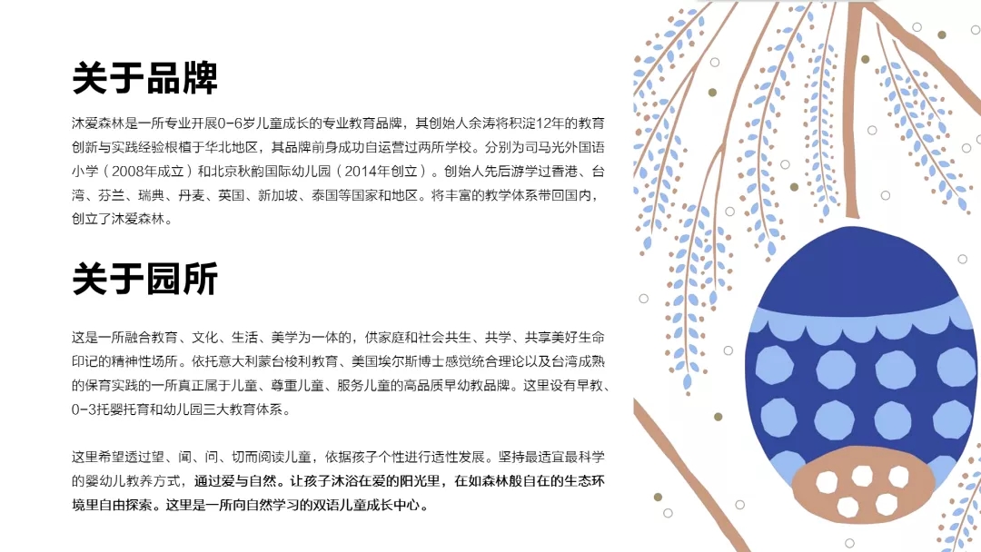 品牌背景:沐愛森林是一所專業開展0-6歲兒童成長的專業教育品牌,這是一所融合教育、文化、生活、美學為一體的,供家庭和社會共生、共學、共享美好生命印記的精神性場所。依托意大利蒙臺梭利教育、美國埃爾斯博士感覺統合理論以及臺灣成熟的保育實踐的高品質06早幼教品牌。這里設有母嬰商店、早教、0-3托嬰托育和幼兒園三大教育體系。