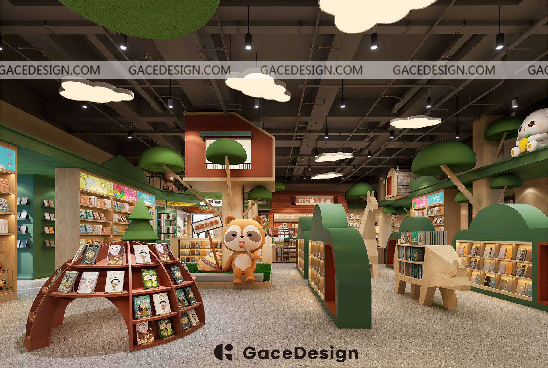 ?設(shè)計師希望給孩子更多類似森林的行走路徑,通過環(huán)境引發(fā)孩子自主尋找書的樂趣。以“室內(nèi)建筑”為設(shè)計理念,鋪設(shè)綠色草坪,在室內(nèi)開辟一處獨特的“森林仙蹤”場地,設(shè)計手法突出項目層高的優(yōu)勢。功能區(qū)猶如散落在森林的獨棟小屋,樓上樓下,院內(nèi)院外,皆是孩子的專屬天地。