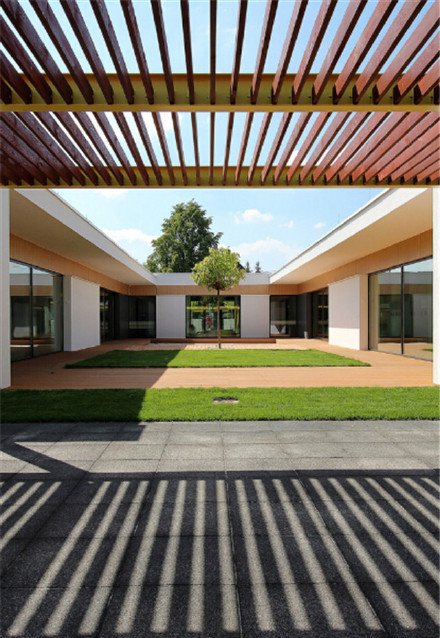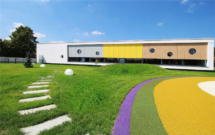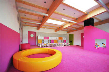 Yellow Elephant幼兒園位于波蘭Ostrow Mazowiecka,單層天井式的建筑結構,屋頂采用膠合木板打造,共有5間,可招收125名兒童。內部的庭院打造沙坑、樹木及草地等,這里也是幼兒園的中心區域。面向庭院的立面安裝大型落地玻璃窗,內部既可以獲得充足的光線,也能欣賞到庭院的景色。幼兒園設計