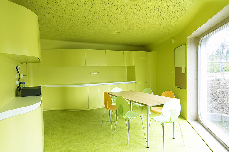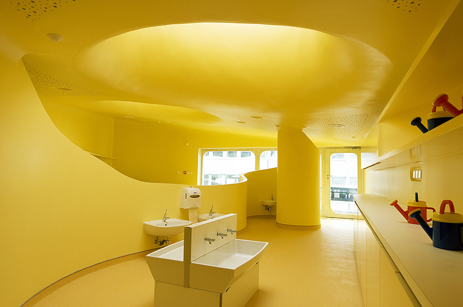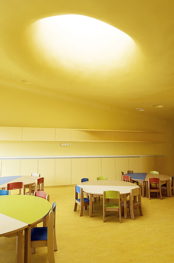 此外雨水管位于建筑側面,這樣家長們永遠不用抱起孩子跨過水溝。內部空間的組織都圍繞著高度安全的圓形中央空間,孩子們的空間圍繞并匯聚于此。每個相鄰的空間都彼此連通便于相互照料,最大程度的保證了安全。中心帷幕似的木結構最高處是3米寬的聚碳酸酯拱形天花板,保證室內全天都沐浴在充足的陽光之下。幼兒園設計