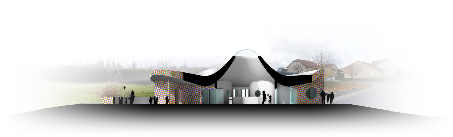 關于保育設施的設計,它是朝南的方位,這給了我們與環境的無縫集成的設想創造了一個平臺,我們的想法是讓這個結構自然傾斜。每個平臺對應像花園,游樂場,教育花園等功能...設施的造型體現了建筑的風格,這簡直就像是是其它教育機構所包圍的局面。我們的建筑物具有既不是“主立面”,也不是“背立面”的特點,但作為一個整體,只有一個邊緣,它只有一個美學上均勻的外觀,其可以從周圍可見。