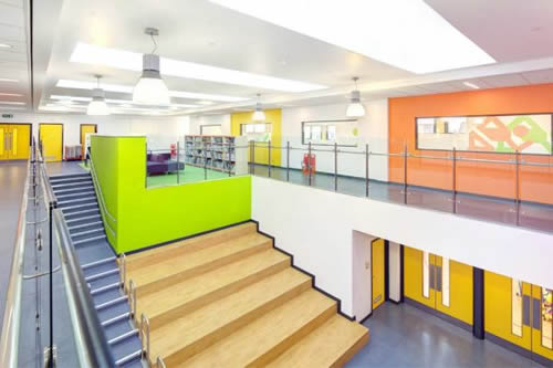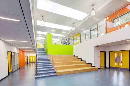 客戶希望擁有一所環(huán)境可持續(xù)發(fā)展的學校,并可以獲得相關的生命周期效益,這些要求被納入了設計開發(fā)中。建筑幾乎完全自然通風,面對一條繁忙道路的立面能夠降低噪音。中央北向窗戶與建筑管理系統(tǒng)相連,建筑管理系統(tǒng)會對建筑內的溫度和二氧化碳含量做出反應。所有的教室和學校大廳都有通風煙囪,可以通過立面的洞口和格柵進行被動通風。建筑過熱的潛在問題通過仔細設計懸挑結構和建筑朝向得到了解決,無需使用機械通風和制冷設施。環(huán)境性能取決于細考慮的建筑方案,并通過能對日光、熱和二氧化碳含量做出反應的“智能”機電系統(tǒng)得到提高。