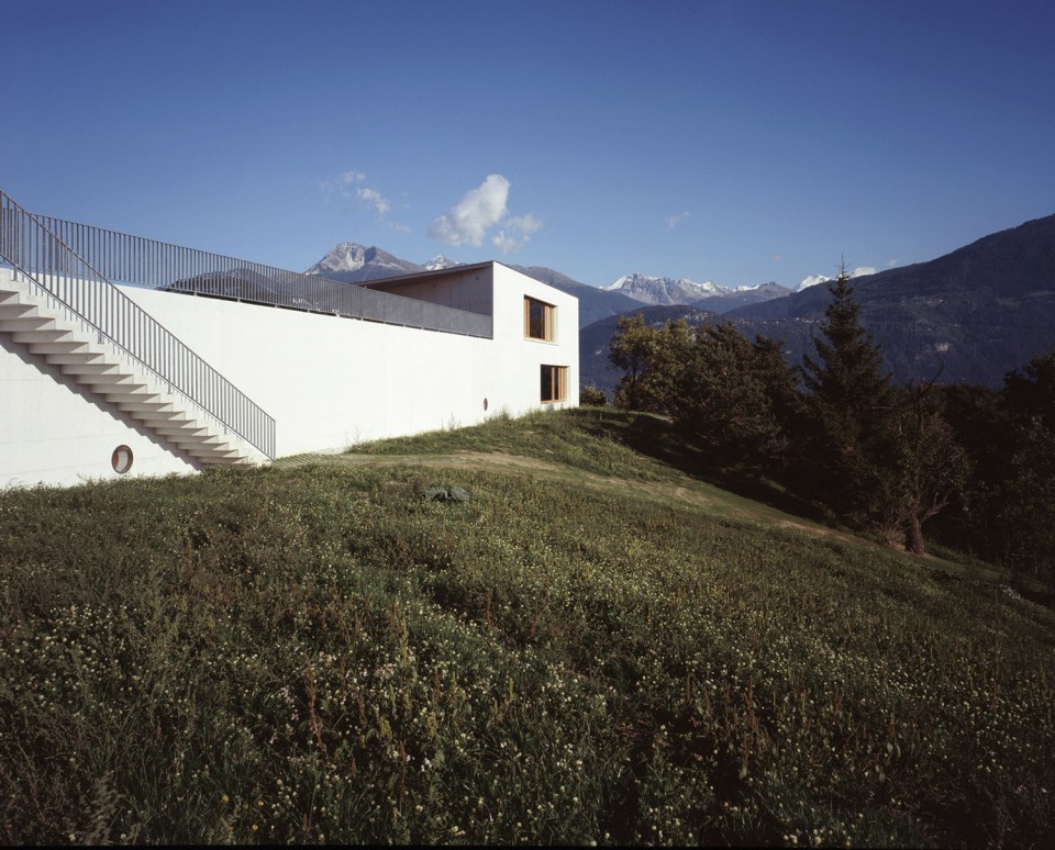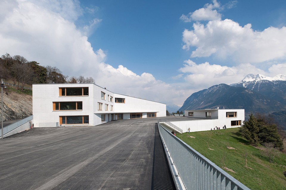 順應(yīng)著山勢(shì),學(xué)校和多功能廳互成角度地連接在一起。兩者位于同一屋檐下,極大地方便了小朋友們使用體育館。反之 當(dāng)大廳內(nèi)舉辦活動(dòng)時(shí),參與者也可以很便捷地使用學(xué)校的餐廳。兩層高的幼兒園位于南側(cè)稍低的地平上, 可以俯瞰整個(gè)山谷的美景非常壯觀。封閉的游樂(lè)場(chǎng)位于兩個(gè)樓層的中間平面上,方便到達(dá)和使用。