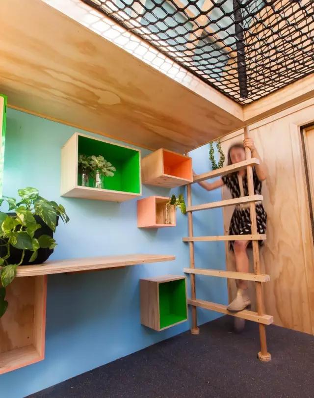 小木屋的頂部使用的是彎曲透明的屋頂,可以使得陽光能夠直接的照射到室內(nèi),還有就是屋內(nèi)設(shè)置了一個(gè)很有趣味性的功能網(wǎng),通過室內(nèi)的小木梯可以上到屋頂下的掛網(wǎng)上玩耍是一個(gè)非常不錯(cuò)的體驗(yàn)。