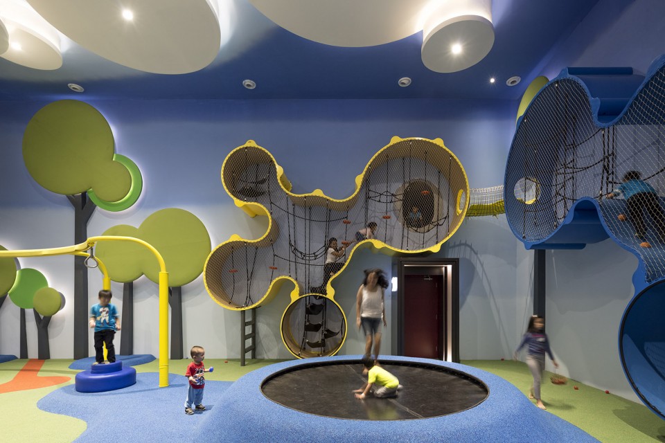 從游戲區(qū)到觀影區(qū)有許多有創(chuàng)意的出入口,需要孩子們?nèi)ヌ剿骱桶l(fā)現(xiàn)。其中一個最刺激好玩的入口是爬到黃色‘Wall- o-lla’樓梯的頂點(diǎn),通過一個管道滑梯到達(dá)觀影區(qū)屏幕下方的彩色海洋球池中。Cinemaxx 不僅僅是一個游樂場和電影院,這兩者無縫巧妙的融合使一家人在這里愉悅的相處,并讓人在兒童的歡聲笑語中也能很好的觀賞電影。(幼兒園室內(nèi)設(shè)計)