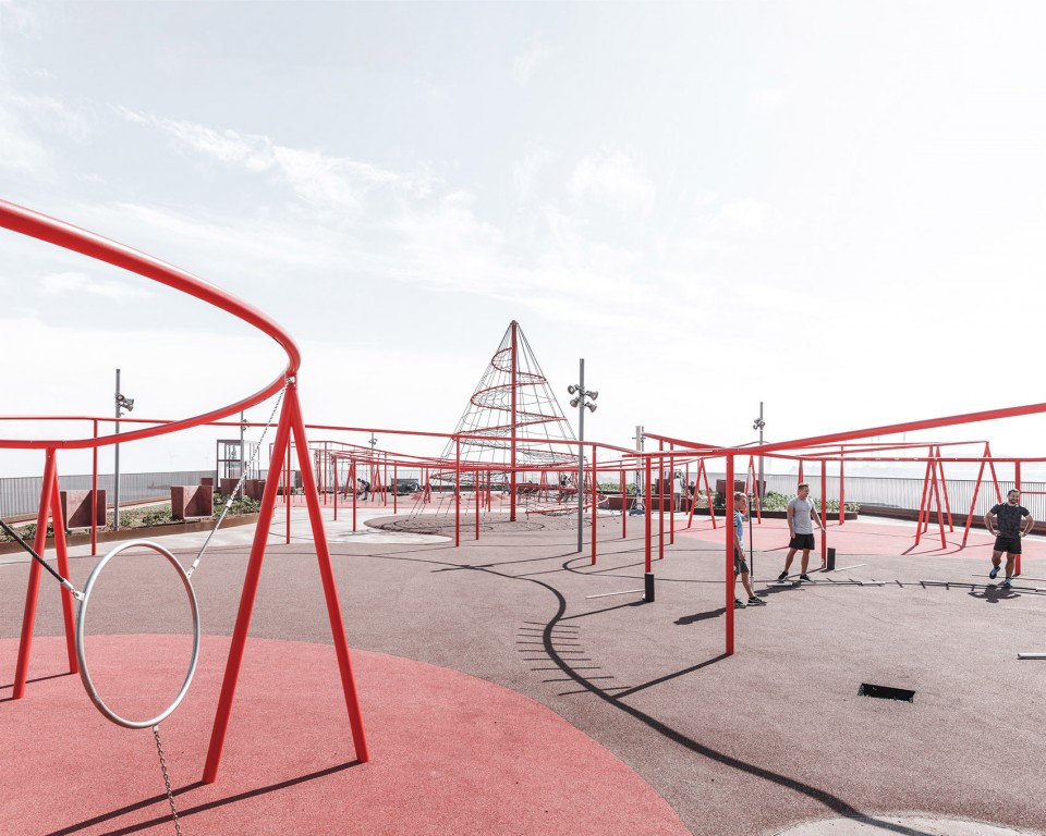 設(shè)計師沒有遮掩而是希望以暴力的結(jié)構(gòu)打破立面,樓層的外部掛著一系列的種植槽,和建筑的結(jié)構(gòu)相呼應(yīng),在給人們創(chuàng)造適宜的空間的同時也把綠色帶到了每個角落,兩條巨型樓梯穿插其中,樓梯之上采用鋼制扶手防護延綿而上,而轉(zhuǎn)到屋頂之后則是轉(zhuǎn)化為秋千、攀爬架、單杠等等面向各個年齡階層的運動游樂設(shè)施,創(chuàng)造出一個活力十足的公共空間。