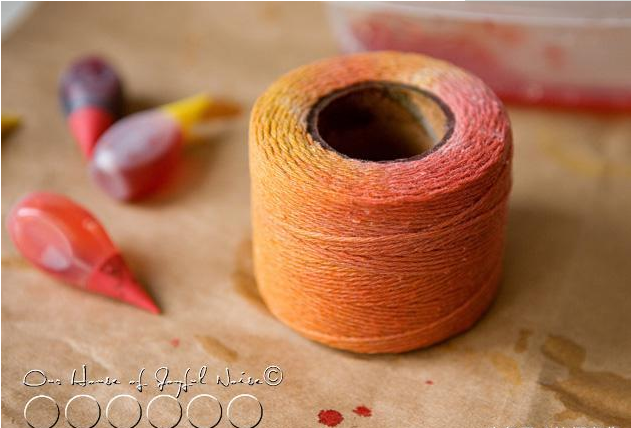 將食用色素放在不同的容器中加入水調和(黃色和橙色),線軸的不同側面浸泡在食用色素溶液中。(老師們也可以直接用絲帶代替)