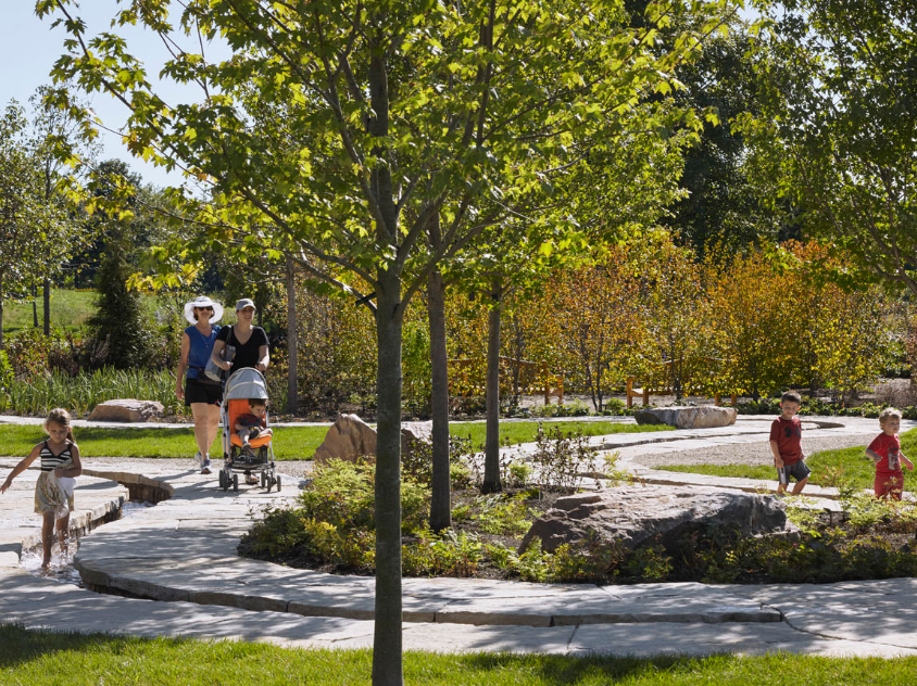 雷根斯坦學(xué)習(xí)園區(qū)是芝加哥植物園新設(shè)的環(huán)境探索中心和自然游樂場。這個占地六英畝的園藝園區(qū)作為科學(xué)園藝中心,為充滿活力的家庭社區(qū)服務(wù),提供與自然環(huán)境的互動體驗(yàn),每年游客量超過12.5萬人。該設(shè)計(jì)促使家庭和各年齡段兒童參與豐富的戶外體驗(yàn),例如以探索為導(dǎo)向的學(xué)習(xí)和游戲,從而更深入了解生態(tài)系統(tǒng)。廣闊的花園提供各種自然體驗(yàn)和探索活動,游客穿梭在草地、戲水小路、石塊、多樣的林地種植和柳枝隧道中。這個再生工程被設(shè)想為通向自然世界的門戶,一年四季提供探索與創(chuàng)造的機(jī)會。