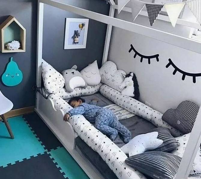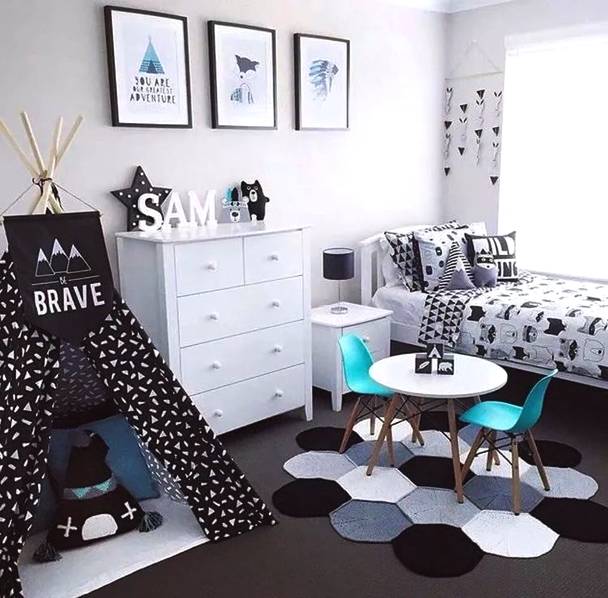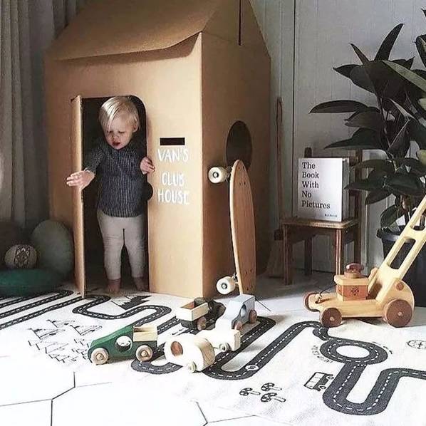 房間里還可以設(shè)置一些簡易的玩樂設(shè)施。1-3歲的孩子需要父母的時刻陪伴,我們可以在房間或者客廳放上爬行墊+安全圍欄給孩子一個小區(qū)域領(lǐng)地,把這里變成一個親子小游戲區(qū)。在兒童房里也可以在地面貼上玩具貼紙,把局部地面變成孩子的游戲地圖,適合在游戲中培養(yǎng)孩子創(chuàng)造力和分享的意識,留出空間,讓孩子可以和朋友或者和父母一起玩玩具,孩子1歲之后我們可以適當添置一些矮柜來收納玩具,還可以讓孩子扶著學(xué)走路。在兒童床上加一個木架結(jié)構(gòu),把床做成木房子,給孩子一個開放的獨立空間。這種具象的區(qū)域不僅會給孩子安全感,還能滿足他們的探險欲,