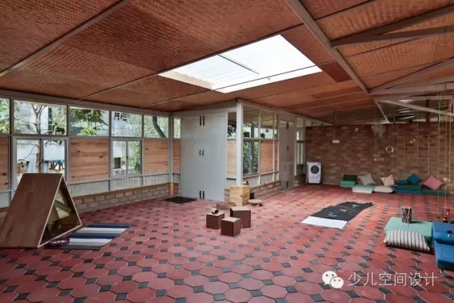 建筑包含4間教室,中心廣場邊上的一間工作室和一間幼兒啟蒙中心的房間與廣場之間有著過度的濾光板。衛生間的設計考慮到了低領人群,小型的尺度不僅適合孩子,還方便監護。衛生間暴露的排水管與小便墻的設置能夠被孩子舒適地使用,并易于維護。