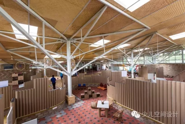 通過滲透性的室內設計,鼓勵了孩子們的探索學習——不同高度的墻體圍合了懸挑的教室和公共空間,其上是穿孔的天窗。屋頂收到8根柱子的支撐,每一個形式都是樹枝分叉。這個樹的形式,在形成結構元素的同時,讓屋頂的高度能夠更為孩子們所感知。“樹”下的空間同時重新詮釋了學習的區域,這樣的場景在郊外隨處可見。