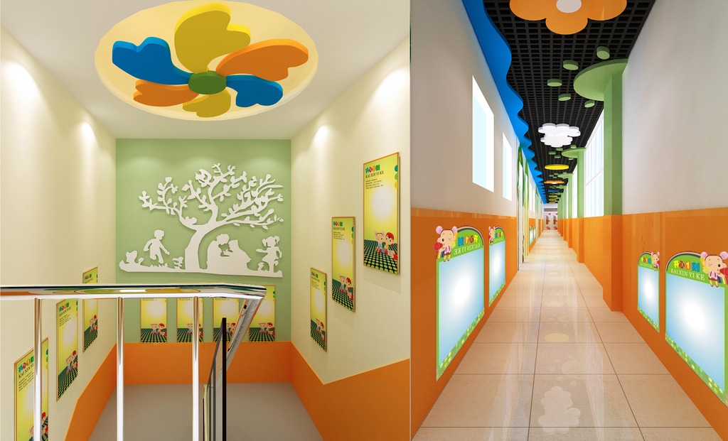 大廳頂部為雙園形黃綠套色吊頂,象征母親與幼兒,月亮與星星;大廳墻面制作一米半高的中孔文化墻,從造型孔中露出背面擺放的金魚缸,自由自在的金魚呈現出幼兒園生機活潑的景象。園的廊墻面布置以抽象畫或抽象作品為主,色調為黑、白、灰、橙色的搭配為主。走廊頂部安裝網狀鋼網,便于吊掛裝飾物。走廊立柱以五彩或橙色為主。(幼兒園室內設計